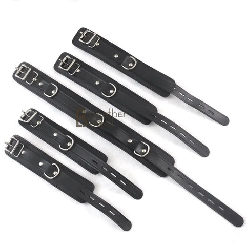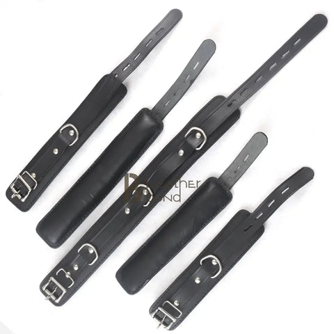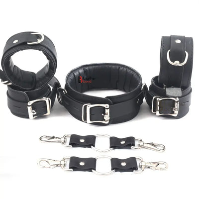 Real Cowhide Leather Wrist and Ankle Cuffs with Neck Collar Restraint Bondage Set Black 7 Piece Padded Cuffs with two connectors