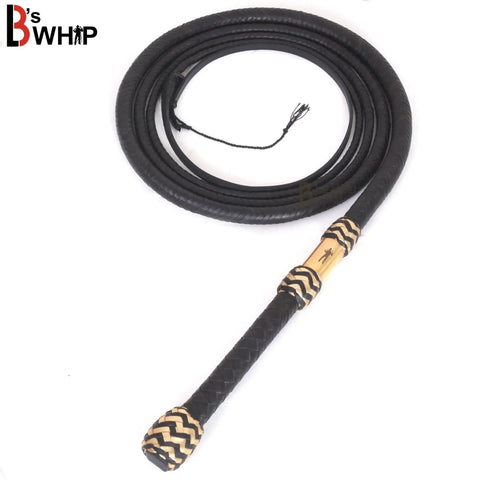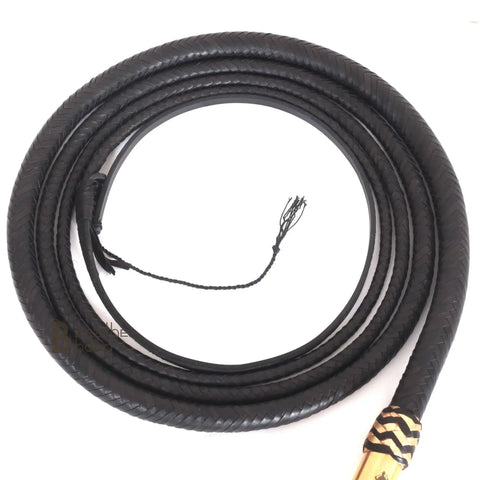Bull Whip 6, 8, 10, 12, 14 & 16 Feet long 16 Strands Black Kangaroo Hide Leather Equestrian Bullwhip Gold Accents & Ferrule Leather Belly & Bolster Construction - Leather Bond