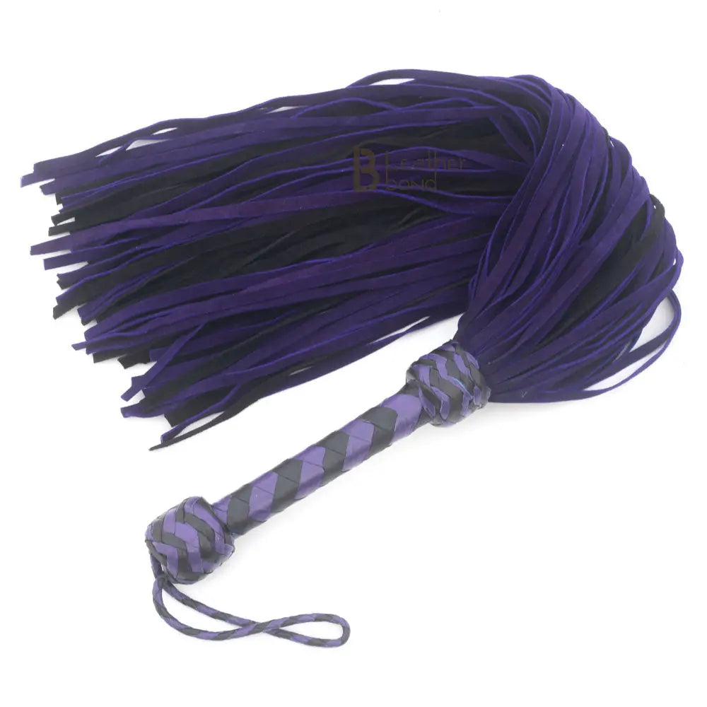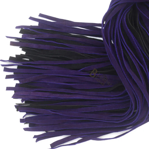 This handcrafted Purple & Black Suede Leather Flogger features a massive 75 falls for deep, dense, thuddy impact. Made from 100% genuine cowhide suede and finished with a real leather braided handle, this piece is made for those who demand volume, visual impact, and control in every strike.
