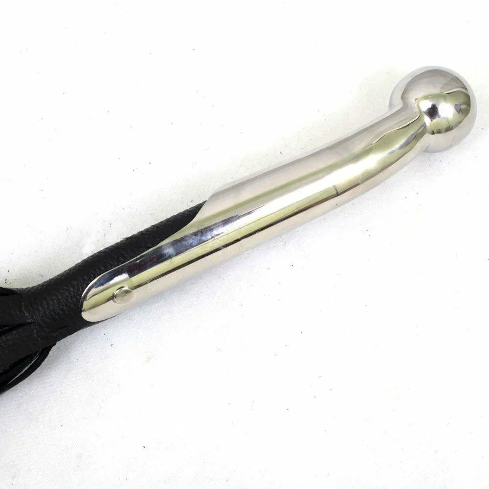 Detailed view of the steel handle of a BDSM leather flogger, emphasizing durability and control during use