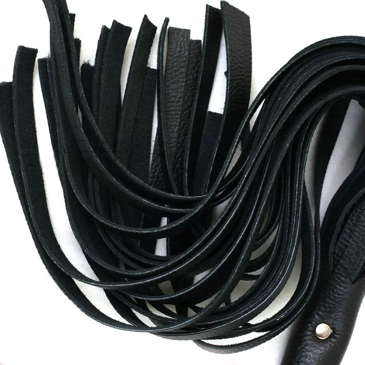 25 black falls of a genuine cowhide leather flogger, designed for effective flogger sex and intense sensory experiences