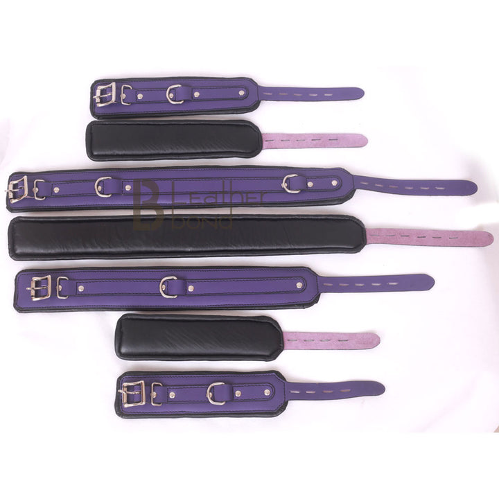 Purple Bondage Set Cowhide Leather Restraint BDSM Set Wrist Ankle thigh Cuffs Collar Set, Paddle, Flogger, Blind Fold & Crop Role Play Set