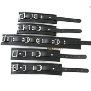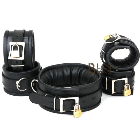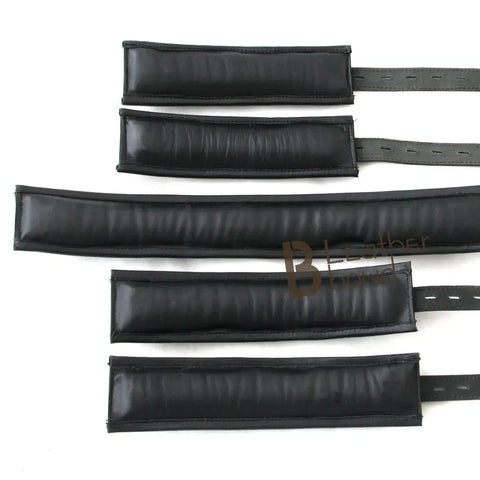 Real Cow Leather Wrist, Ankle Cuffs & Neck Collar Restraint Bondage Set Black 5 Piece set Padded Cuffs Lockable