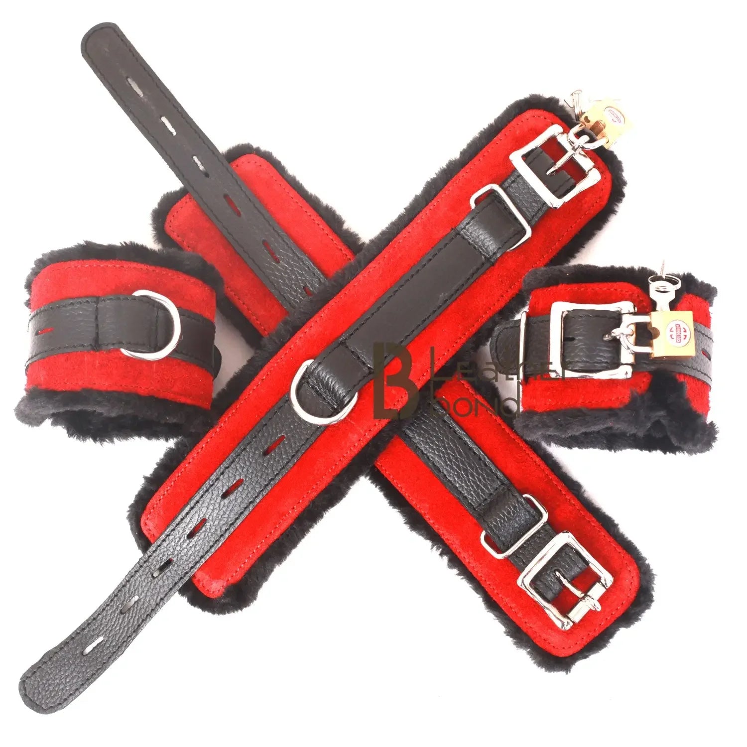 Real Cowhide Suede Leather Wrist and Ankle Cuffs Restraint Bondage Set Red & Black 5 Piece Padded Fluffy Fur Lining - Leather Bond