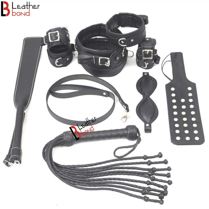 Bad Boy Bondage Set Black Cowhide Leather Restraint Hard BDSM Set Wrist Ankle Thigh Cuffs Collar Set, Paddles, Flogger, Blind Fold, Leash