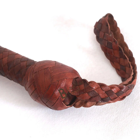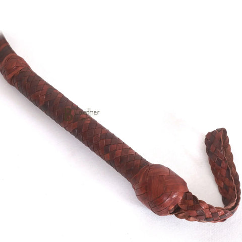 Bullwhip starts with a steel rod for the handle that provides both a solid foundation and weight to balance the thong while a core is an innermost layer inside the thong of the whip. Then consists of two leather braided bellies of 4 strands each and two leather bolsters. The overlay is done in 12 plaits.