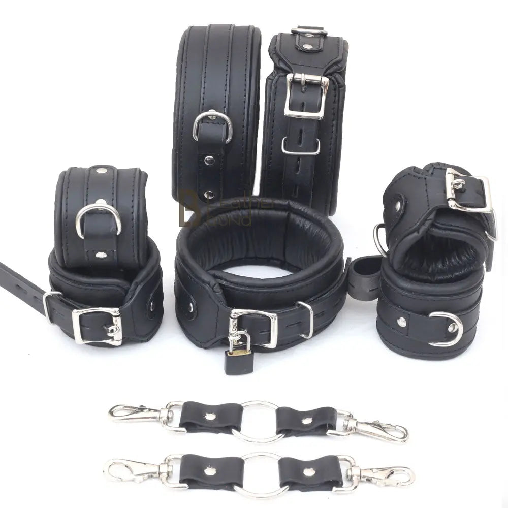 Elevate your bondage play with this premium black leather cuffs set – expertly designed for couples, beginners, and seasoned BDSM enthusiasts alike. As bondage gear for couples, this heavy-duty set includes everything you need – from thigh and wrist cuffs to an adjustable neck collar – all padded and built for comfort. Whether you're introducing soft BDSM restraints for the first time or intensifying your bondage adventures, these adjustable leather cuffs deliver the perfect blend of security, durability, and sensual comfort.